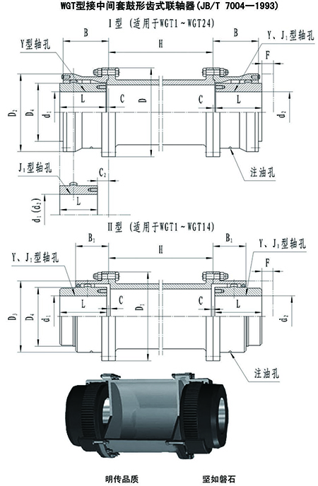 WGT型接中間套鼓形齒式聯(lián)軸器,適用于長(zhǎng)距離聯(lián)接,公稱(chēng)轉(zhuǎn)矩800~1400000N·m。